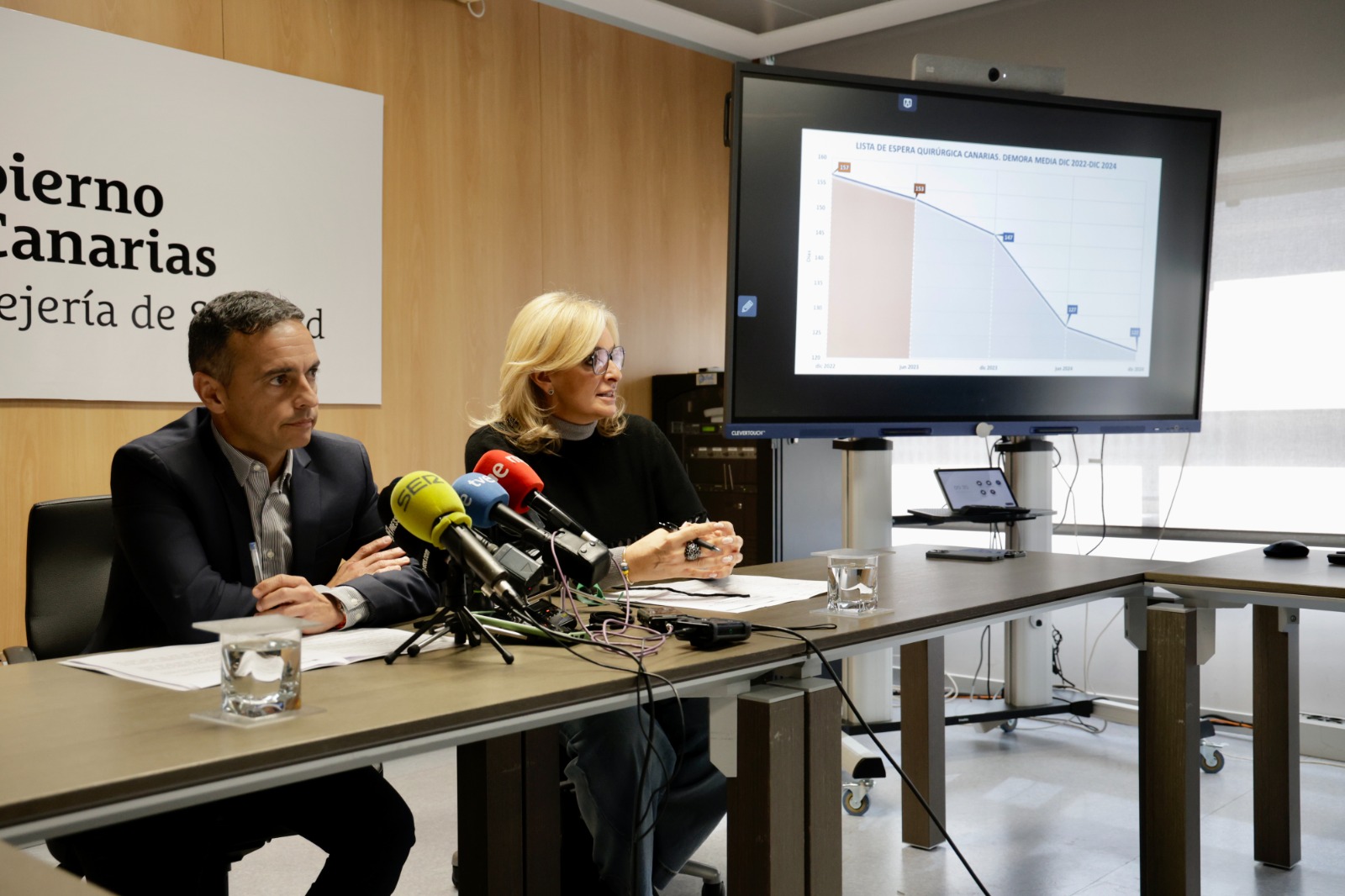 La consejera de Sanidad del Gobierno de Canarias, Esther Monzón, y el viceconsejero y director del SCS, Carlos Díaz, presentaron en rueda de prensa el balance interanual de los datos de listas de espera del SCS correspondientes al 31 de diciembre de 2024. Los datos reflejan la consolidación del Plan Activa que ha permitido un descenso continuado del número de pacientes y de la espera para una intervención desde su puesta en marcha en el segundo semestre de 2023. Respecto al corte del 30 de junio de 2023, el descenso de la lista de espera quirúrgica es del 9,5 por ciento y la espera para una intervención se reduce en 30 días menos.