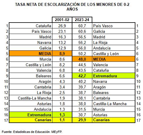 Canarias vuelve a ocupar un puesto rezagado en la implantación del primer ciclo de Educación Infantil (0-2 años), un tramo clave para la equidad social y la prevención del fracaso escolar. Según los últimos datos oficiales del Ministerio de Educación, correspondientes al curso 2023-2024, solo el 29,9% de los menores canarios entre 0 y 2 años están escolarizados, muy por debajo de la media estatal, que alcanza el 48%. Esto implica un déficit de 6.871 plazas en el archipiélago. Lejos de corregirse, esta situación tiende a estancarse. Para el curso 2025-2026, la Consejería de Educación ha autorizado apenas 337 nuevas plazas, según recoge la Orden de 18 de junio de 2025, un avance testimonial frente a las necesidades reales. La Plataforma por el 5% para Educación ha calificado este ritmo como “injustificable” y denuncia que la falta de voluntad política mantiene congelada una etapa decisiva para los menores más vulnerables.