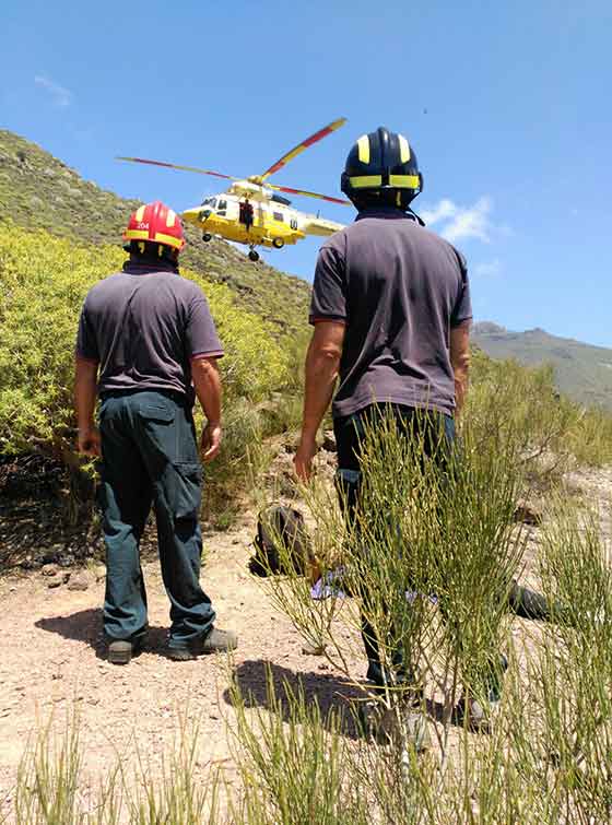 Por otro lado, efectivos con base en el parque de San Miguel de Abona y voluntarios de Santiago del Teide fueron requeridos el sábado para acudir en el rescate de otra senderista que había sufrido un desvanecimiento en Tamaimo, en Santiago del Teide. Llegados al lugar, los bomberos comprobaron que la afectada presentaba un fuerte dolor de espalda y malestar generalizado por lo que se decidió activar al helicóptero para que la evacuación fuera aérea y evitar así agravar las posibles lesiones.