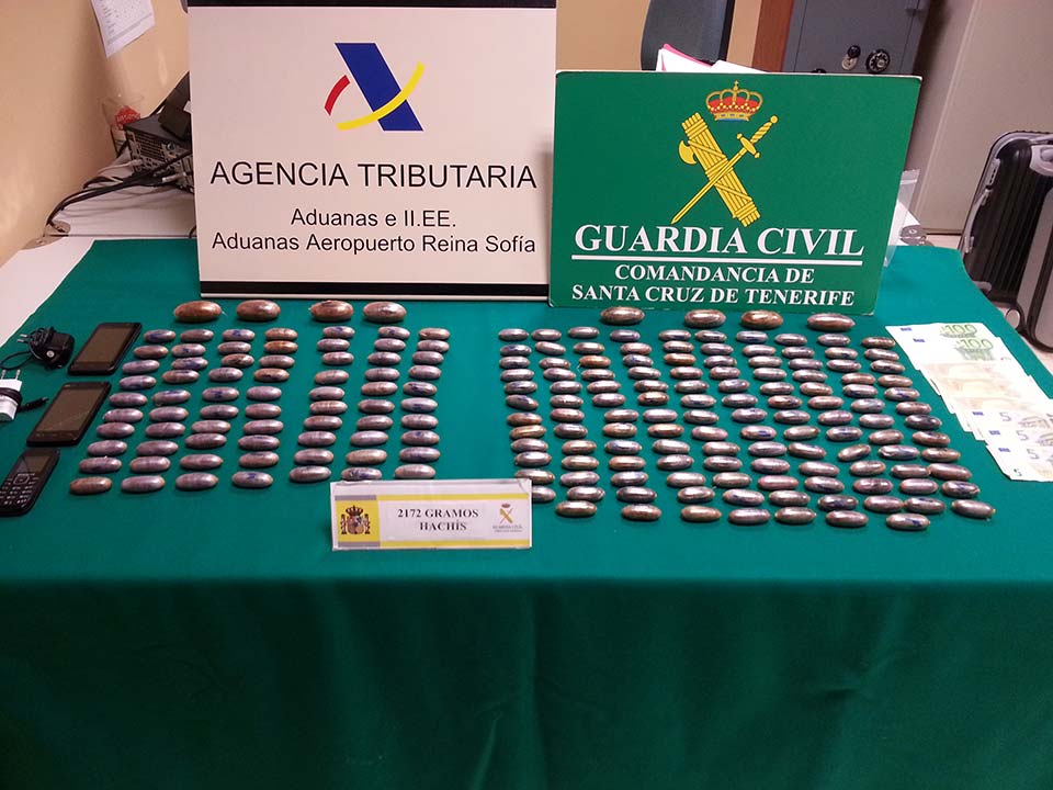 Agentes del Destacamento Fiscal de la Guardia Civil del Aeropuerto Reina Sofía detuvieron a dos varones de 41 y 35 años de edad y vecinos de Sevilla, como presuntos autores de un delito contra la salud pública al intentar introducir en su organismo 2,172 Kg de hachís.