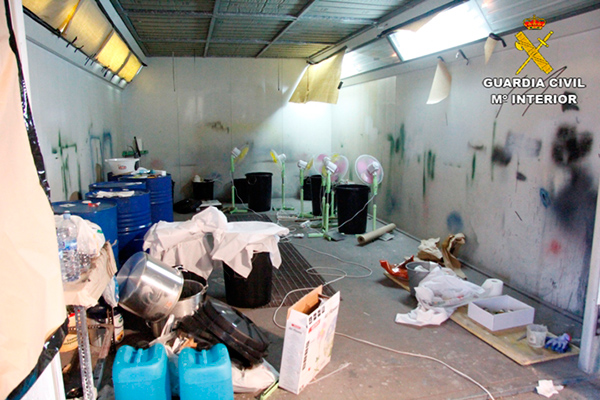 En los registros los agentes intervinieron 1.050 litros de productos químicos y diversos precursores y útiles de laboratorio, 2 pistolas y munición, placas de matrícula y troqueles para confección de estas, 57,5 kilos de pasta de cocaína, 4.200 euros y documentación relacionada con los hechos investigados.