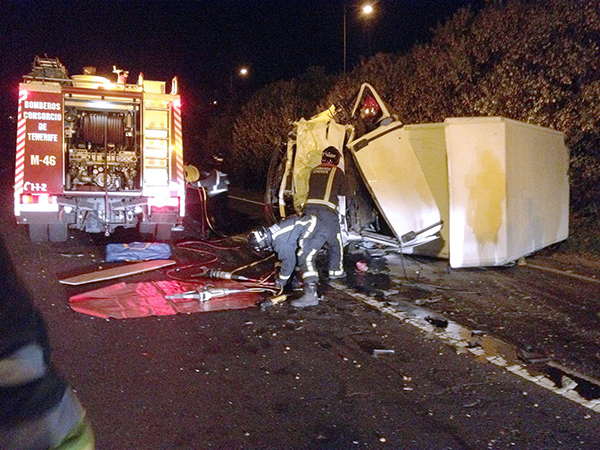 Efectivos del Consorcio Insular de Bomberos, con base en el parque de La Orotava, intervinieron esta madrugada, sobre las 02:30 horas, en un accidente de tráfico que se produjo en la autopista TF-5, a la altura de La Victoria, en el carril de aceleración, en el que un camión volcó con dos personas en el interior de la cabina.