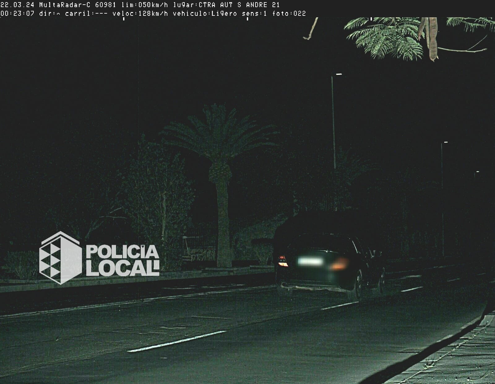 Los agentes adscritos al servicio de Radar de Atestados detectaron a un conductor infringiendo la velocidad máxima permitida establecida en 50km/h en la carretera de San Andrés. El infractor fue captado por el cinemómetro a una velocidad de 128 km/h a las 00:23 horas del día 22 de marzo en dirección al barrio de Valleseco en sentido sur desde Las Teresitas hacia la Avenida de Anaga.