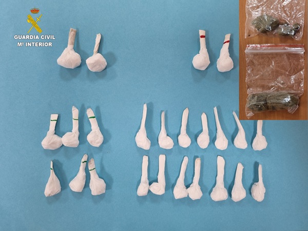 Inmediatamente, ante la sospecha de que se hubiera producido un intercambio de sustancias estupefacientes por dinero, la Guardia Civil interceptó a los compradores, a los cuales se les intervino una bolsa de plástico con presunto hachís, hecho que fue contrastado al identificar al vendedor que portaba en uno de sus bolsillos una bolsa de plástico conteniendo hachís de idénticas características a la intervenida a los compradores y 55 euros en billetes de diferente valor.