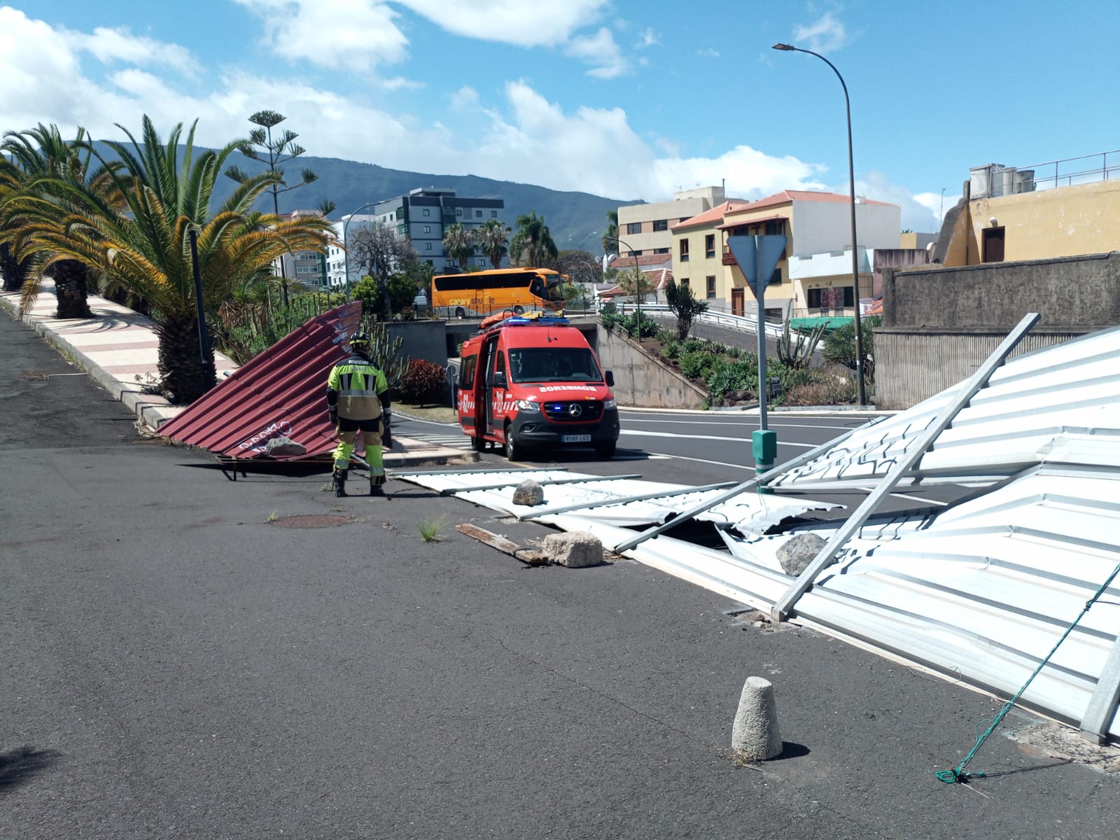 Por un lado, fueron requeridos, sobre las 11:00 horas, para retirar una lona de grandes dimensiones que se había caído poniendo en riesgo a los peatones en la calle El Majuelo, en Buen Paso. También retiraron una valla caída perteneciente a una obra en el paseo de la Centinela y una pérgola que corría riesgo de caerse desde una azotea en la calle El Sol.