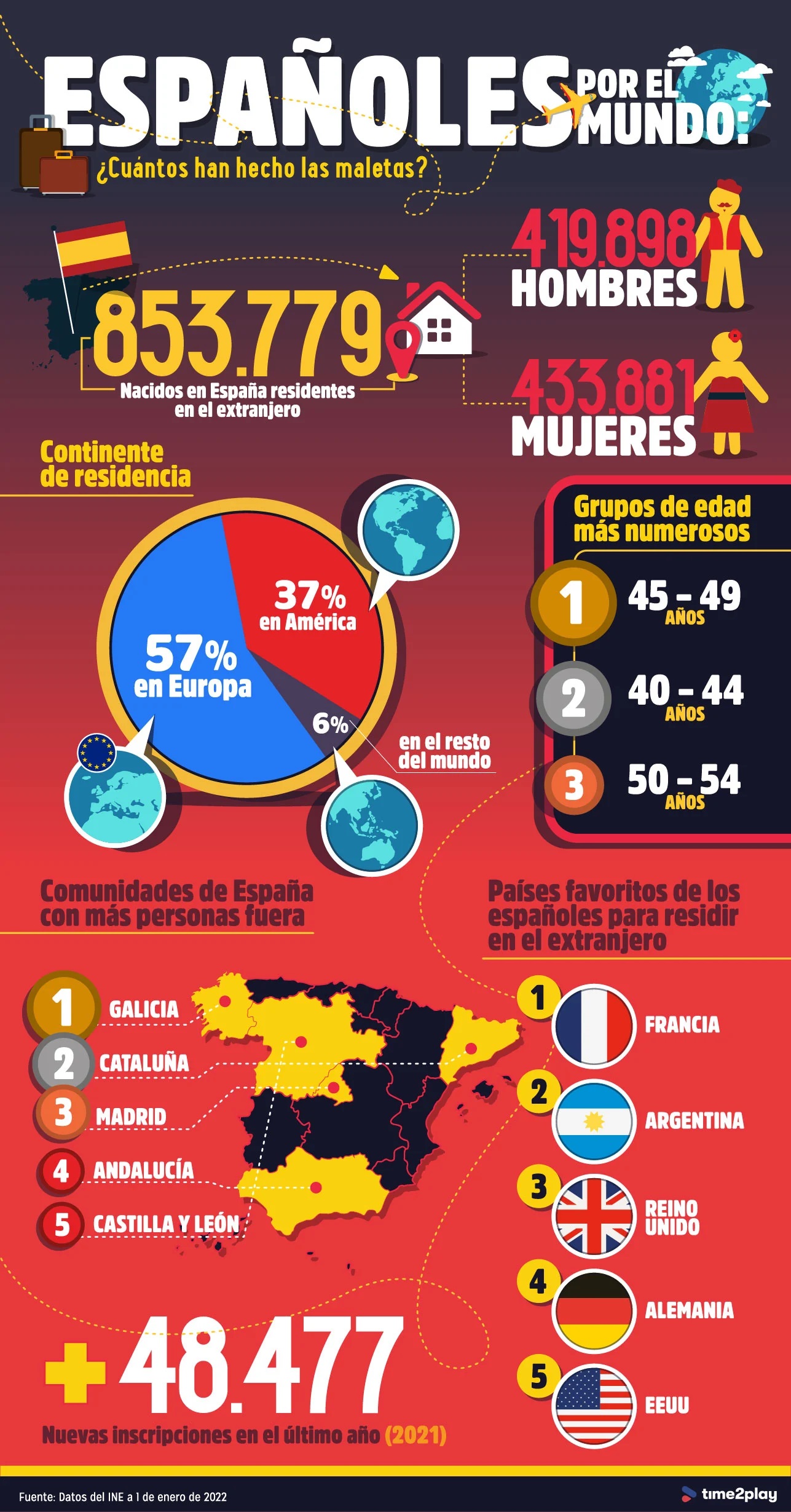 Analizamos los datos publicados por el Instituto Nacional de Estadística (INE). Los datos tienen fecha de 1 de enero de 2022. Para las estadísticas y los datos presentados en el contenido y los infográficos, solo se tuvieron en cuenta las 853.779 personas que nacieron en España y que actualmente residen en el extranjero.