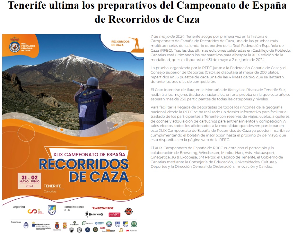 Es tiro al plato pero se llama «recorridos de caza», y no cabe duda que hay que fecilitar tanto a la Federación de Caza como al Cabildo, Gobierno de Canarias, ayuntamientos implicados… en este gran evento que reunirá, por primera vez en Canarias, nada menos que a 250 tirardores que entre el 28 de mayo y el 2 de junio y que descargargaran probablemente más de 3.000 kilos de plomo (utilizarán más de 60.000 platos y el doble de cartuchos) sobre cardones y tabaibas en la pequeña franja de suelo rústico que queda entre dos munumentos naturales, Derriscaderos y Montaña de Ifara y los Riscos en Granadilla de Abona.